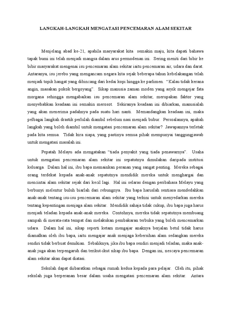 (t) alam sekitar adalah sesuatu yang penting dalam kehidupan manusia, tidak mengira bangsa, agama dan negara. Pengertian pengajaran alam sekitar heimatkunde salah satu usaha untuk memberikan dasa. Download karangan cemerlang pelajar tahap spm. For spm bahasa melayu 2004 paper 1, the question for section a is similar to spm 2005 in the way the question being asked, in which show four pictures of various pollution as the result of development with the title 'pembangunan dan alam sekitar (the development and the environment)' at the. Usaha pemeliharaan alam sekitar semakin menjadi agenda yang penting rakyat malaysia termasuk syarikat swasta untuk memenuhi tanggungjawab sosial korporat.